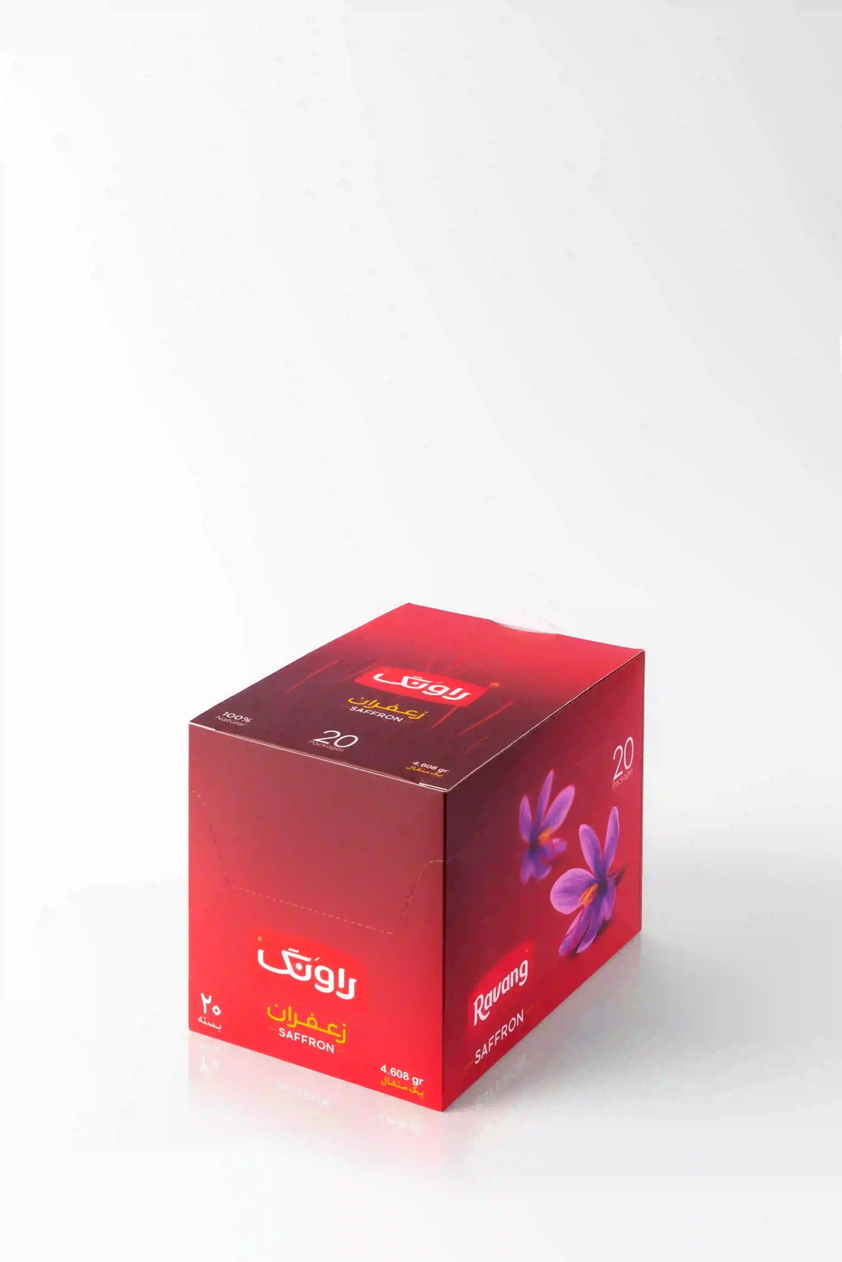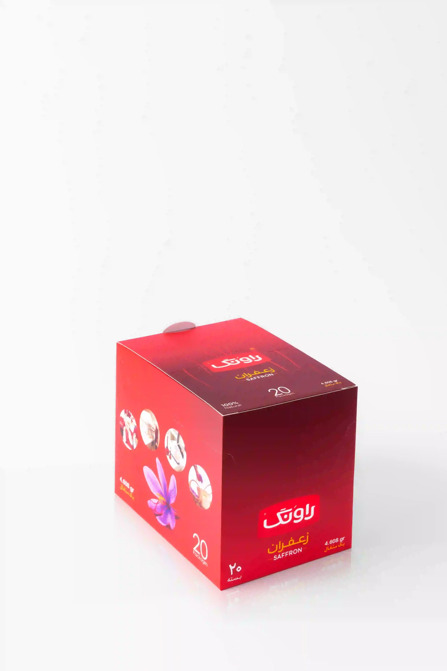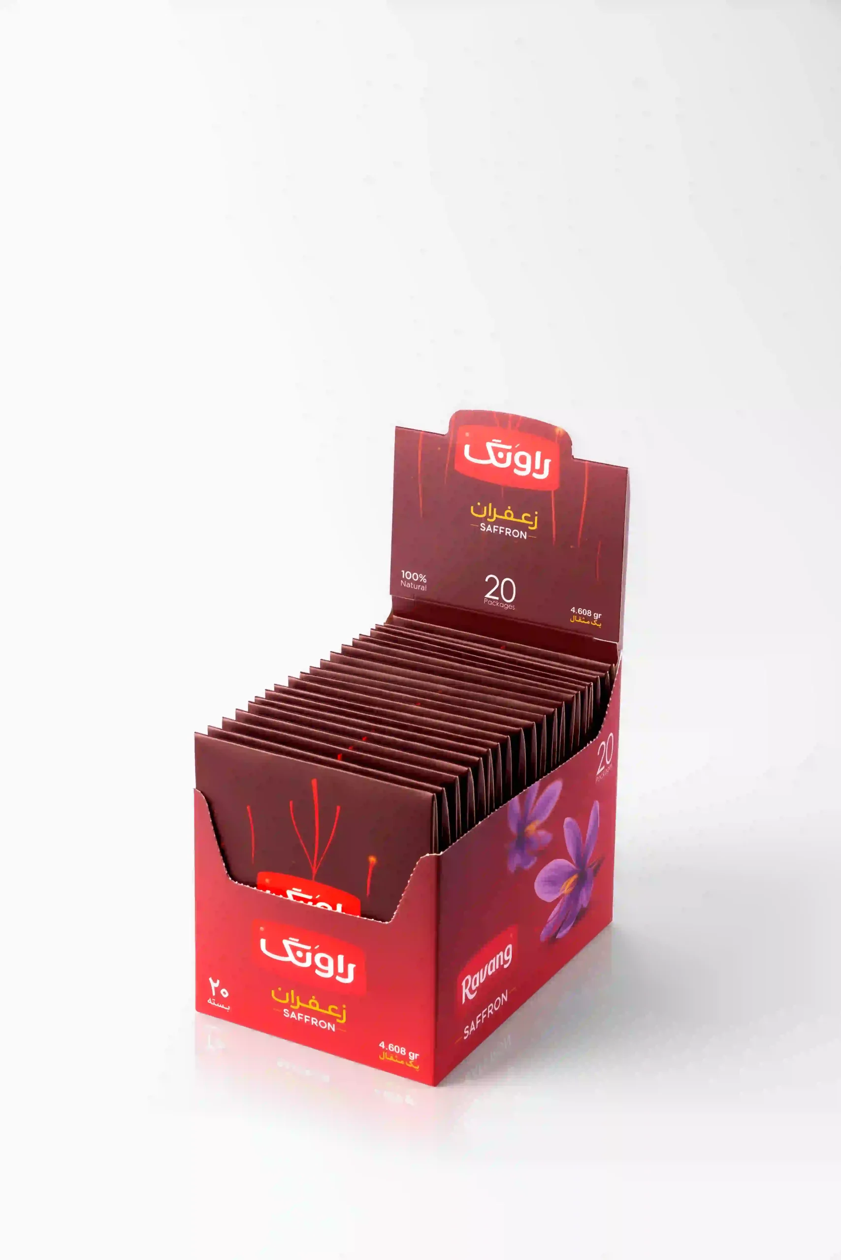 Ravang pocket saffron (4.608 g) is suitable for preserving the product’s flavor, color, nutritional value as well as maintenance period. Cellophane used in this type of packaging is food-grade and protects the product from moisture and temperature. The advantage of this type of packaging is its low weight and low price, compared to other available packages. Moreover, this packaging makes it possible for the costumers to order different weights of saffron according to their needs.